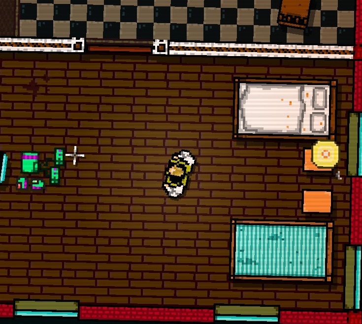 In Hotline Miami, you control a nameless pixel art protagonist who most certainly is not modeled on Ryan Gosling in the movie Drive, obviously, why would you even entertain such a silly notion, who is tasked with mowing down wave after wave of pixel art Russian mobsters. Also, it’s the 80’s, and you’re in Miami. The game is divided into chapters, which are in turn divided into stages. You clear a stage by killing all enemies within that stage, and when you die, you restart at the beginning of the current stage. However, should you advance in the chapter and quit the game for whatever reason, you will have to start the entire chapter over next time you play, regardless of how many stages you cleared.
