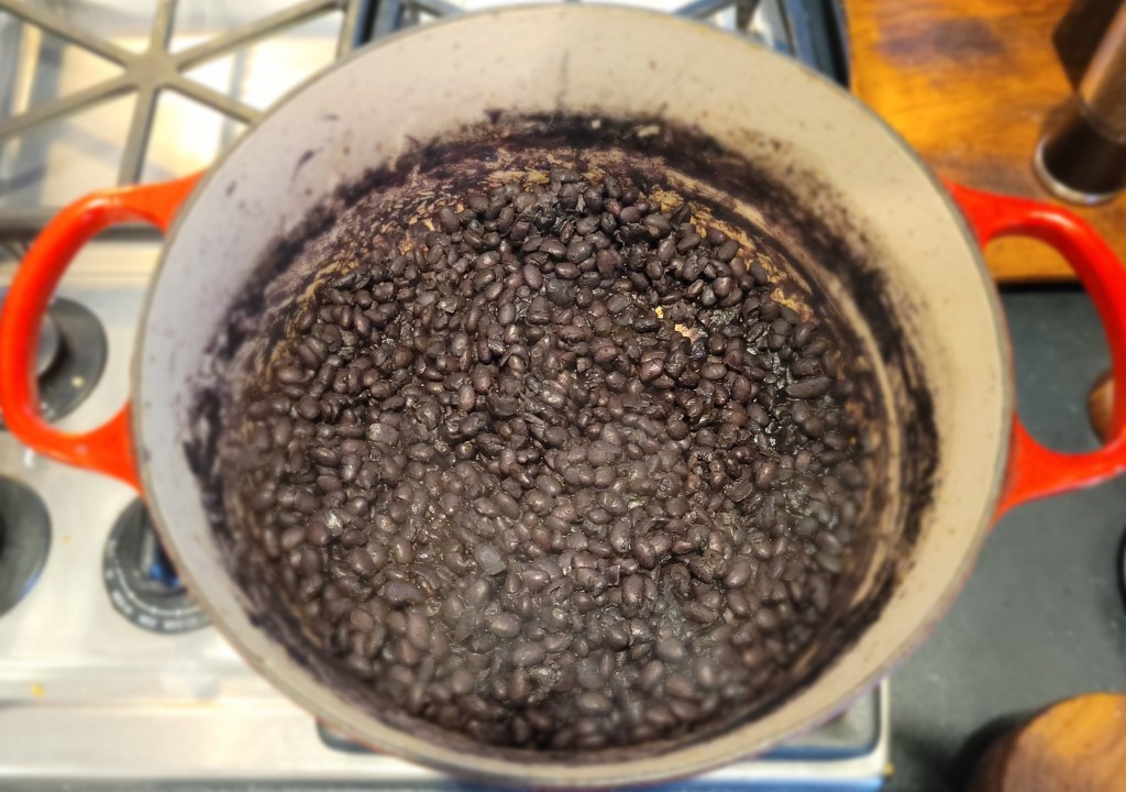 There’s one last bit of actual work to do. It is quite likely that there will be a bunch of liquid remaining in the pot once the beans are cooked, and you’ll want to get rid of it. You could simply dump then into a strainer, but this would put your delicious aromatics at risk, so I recommend cooking this liquid off. Bump the heat back up to high, and once it reaches a full boil, stir frequently. The liquid will thicken into a thin dark coating, and once it has, you’re done. Turn the heat off. You must believe me when I tell you this coating is delicious, however, you can always rinse it off of your beans prior to deployment.