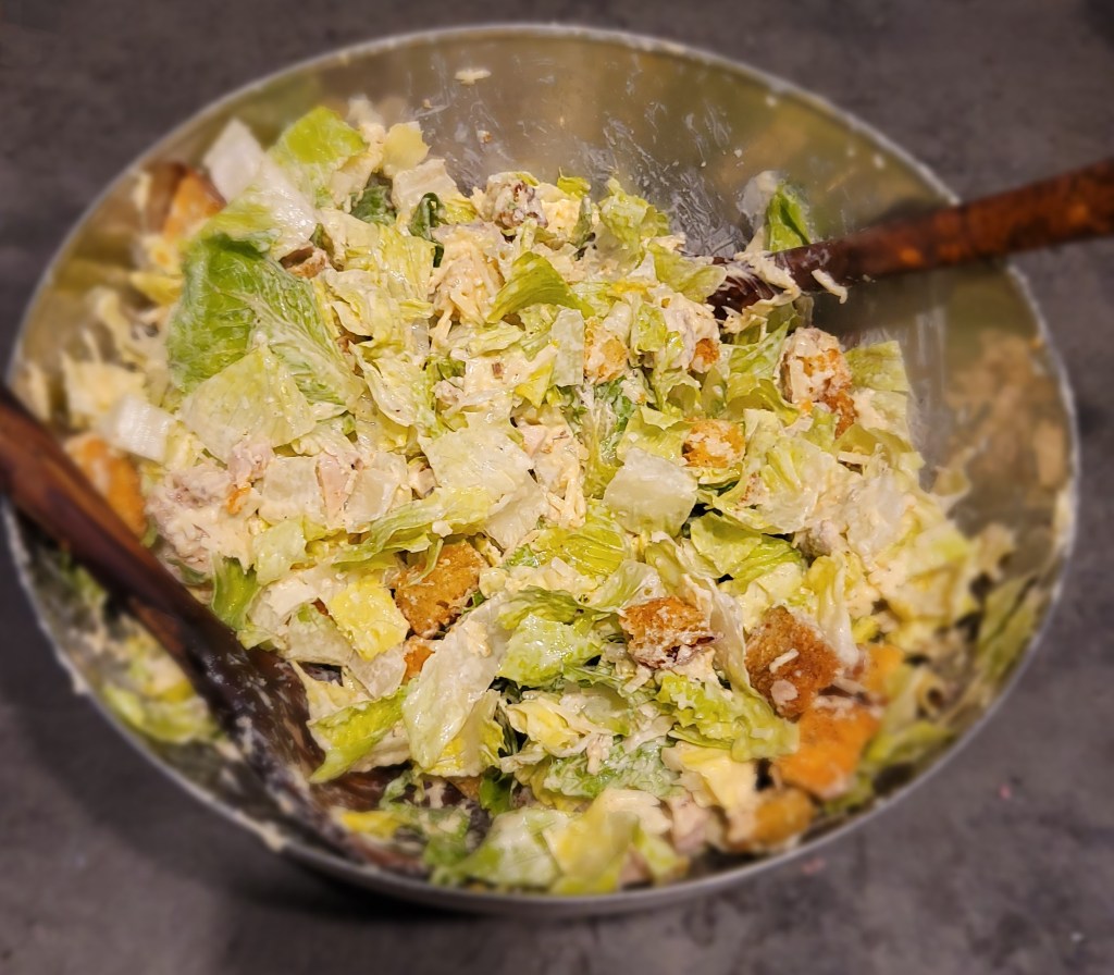 OK! All the advance work is done. As you no doubt agree, there was kind of a lot of it but it was all dead easy. Now comes assembly, which is even easier. Chop and wash some romaine lettuce and dump it in your serving bowl. Next, add as many croutons as you wish, then the sliced chicken, then the dressing and last but not at least, a goodly portion of finely shredded Parmesan cheese. Eyeball the proportions, here; as always, the beauty of cooking something yourself is that you can cater the final product to your own tastes. Toss everything together until it’s all well-distributed, then serve into bowls and enjoy! Delicious, and somehow even less healthy than the Cobb salad. Nothing you’d call a vegetable was anywhere near this thing at any point. But it has green in it, so it’s healthy, right?
