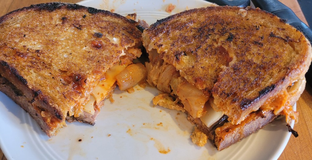 Dig in! Note how this sandwich scratches a similar itch as a Rueben. It’s salty, it’s tangy, and it is most certainly fatty. But also, note how while it is less directly acidic, it’s also smoky and a little bit sweet and pleasantly spicy. The lesson here is twofold. First and foremost, whenever you make your sandwiches, make sure you attune to and aim for that sandwich’s proper balance, whatever that may be! Second, this shit is delicious and arose from a scenario in which I wanted one thing and couldn’t get it, forcing me to improvise. Go ye and do likewise.
