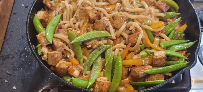 Next, add everything else back into the pot – tofu, peppers, snap peas, and noodles – into the pot, along with a generous few glugs of soy sauce, and a less generous singular glug of the black vinegar, fish sauce, and mirin. These liquids will come to a simmer with the quickness; stir constantly as they do so, to ensure that the ingredients distribute thoroughly and everything in the pan takes on a glossy sheen. Once the sauces have reduced somewhat, you are done. Turn the heat off, sprinkle the whole mess with a few drops of sesame oil if you wish, and serve immediately.